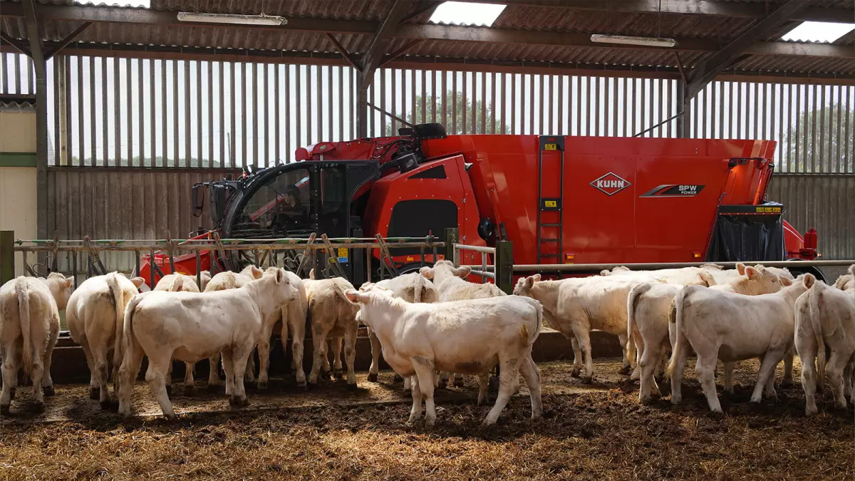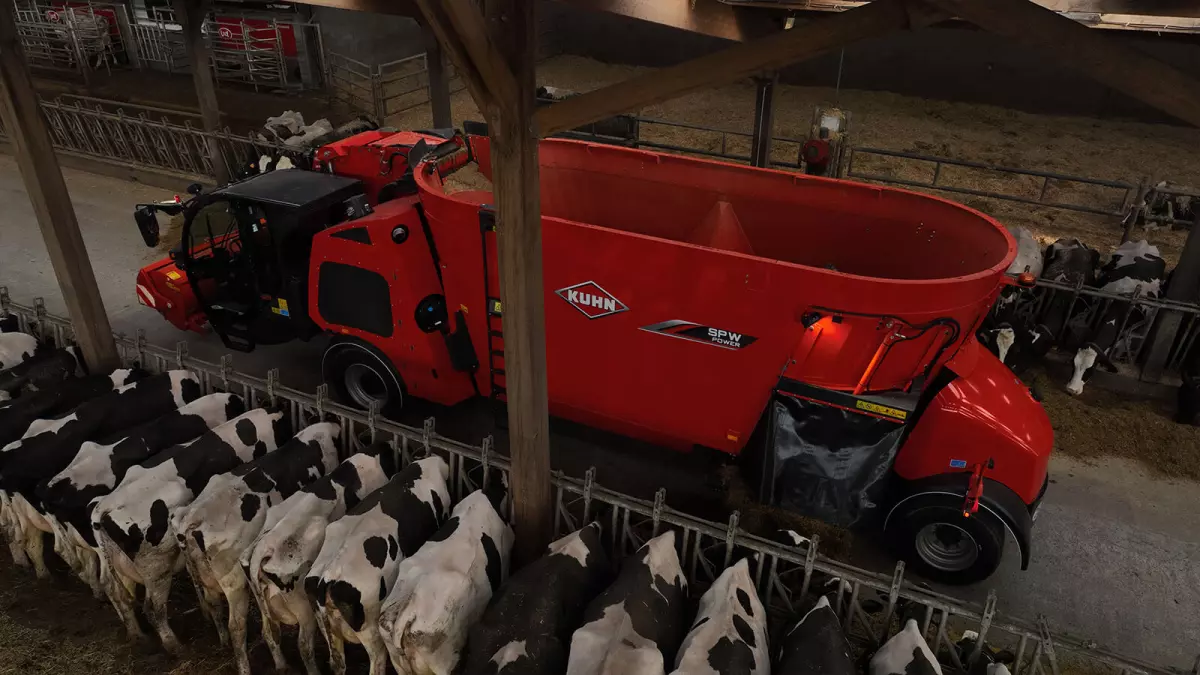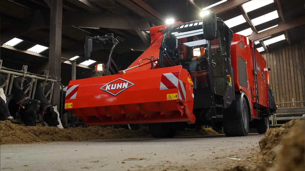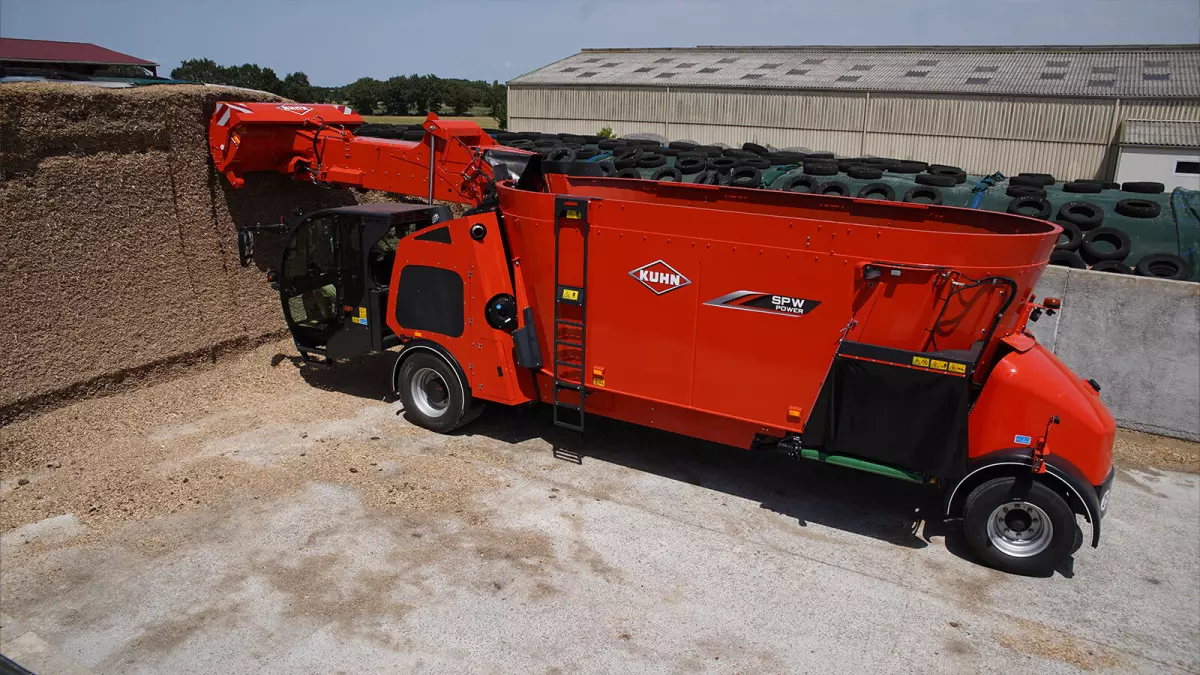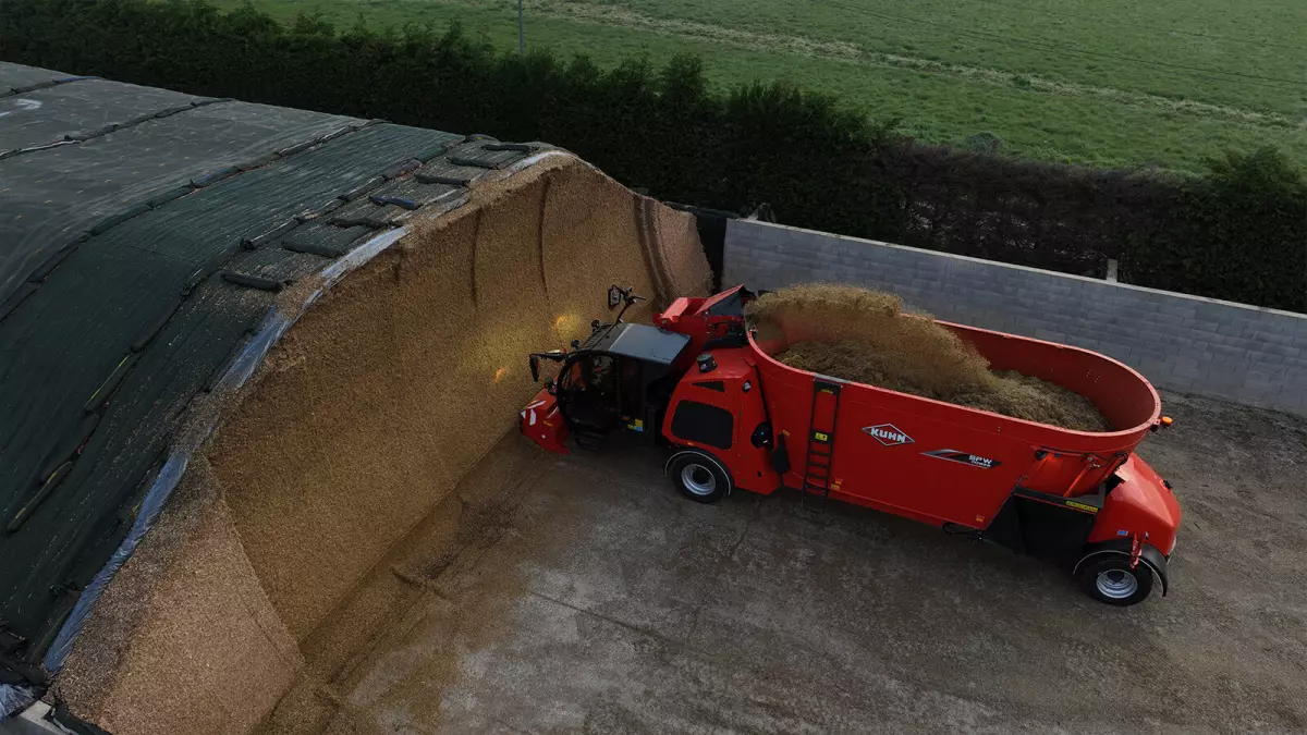 Вимірювання відстані до підошви силосного захвату також є ексклюзивною функцією самохідних змішувачів KUHN. Поблизу підошви силосного захвату швидкість опускання конвеєра знижується, що дозволяє позиціонувати конвеєр без ривків. Підлога силосної ями, вся конструкція фрезерної головки і конвеєра захищені.