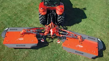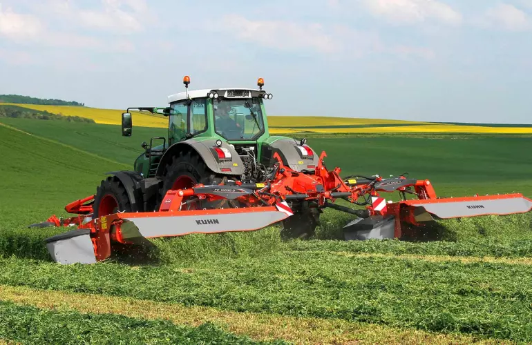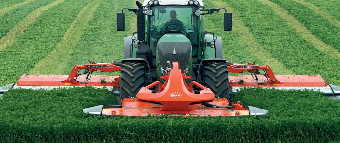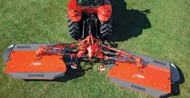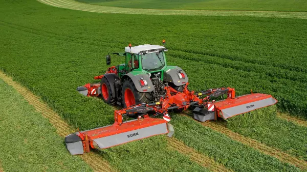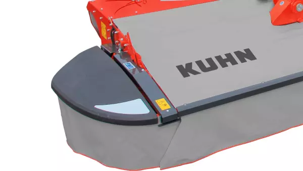 Ексклюзивна кінематика тримодульних комбінованих косарок цієї лінійки включає в себе циліндр підвіски скошувального пристрою (1), запобіжного відпускного циліндра (2), акумулятора з регульованим тиском (3) та шарніра, розташованого близько до центру ваги машини (4).