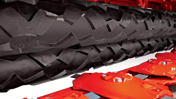 Роторна плющилка зі сталевими зубцями забезпечує високу ефективність роботи особливо для важких, довгостеблових та пізніх культур, а також для обробки короткостеблової рослинної маси. Високопродуктивна система подачі забезпечує рівномірне та швидке переміщення маси через машину. Плющилка цього типу не потребує великої потужності завдяки швидшому проходженню маси та відсутності потреби в її рециркуляції. Добре структуровані валки, у яких багато повітря, утворюються завдяки положенню пальців, які розпушують масу та спрямовують її догори перед формуванням валка. Отримана кормова маса має вищу енергетичну та поживну цінність завдяки прискореному висиханню.